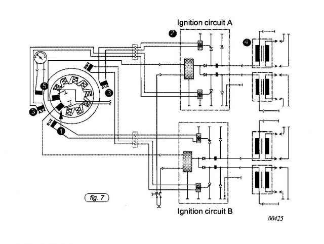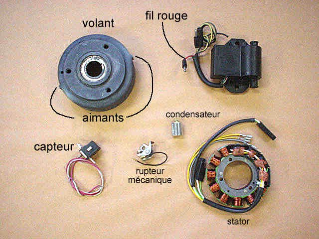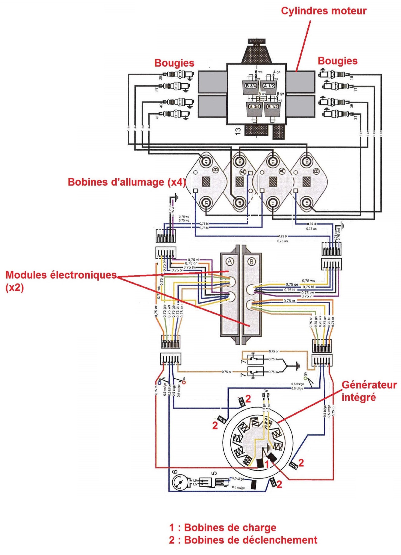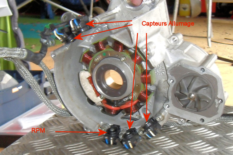 Au moment de l'allumage, deux des quatre capteurs actionnent la décharge des boitiers électronique via le circuit primaires des doubles bobines d'allumages