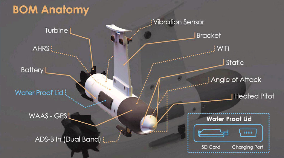 Tous les composants sont intégrés, tels que AHRS, GPS, ADS-B, AoA, enregistrement de données et capteurs de pression, ce qui en fait une plate-forme totalement indépendante, sans fil.