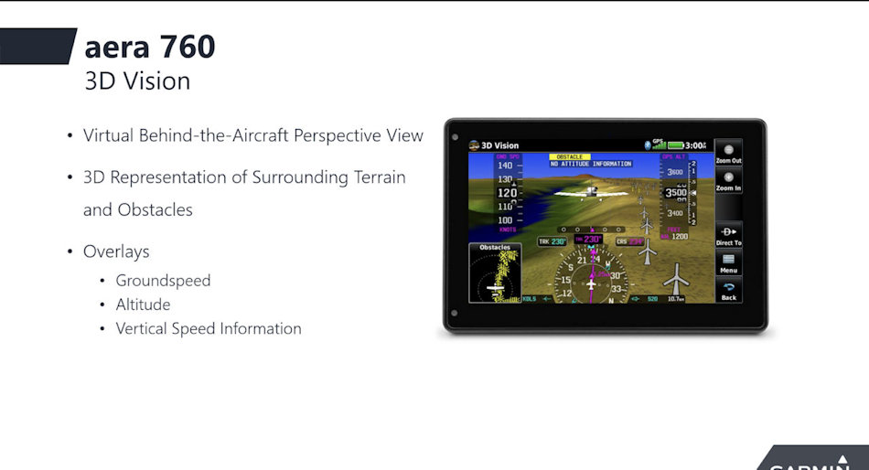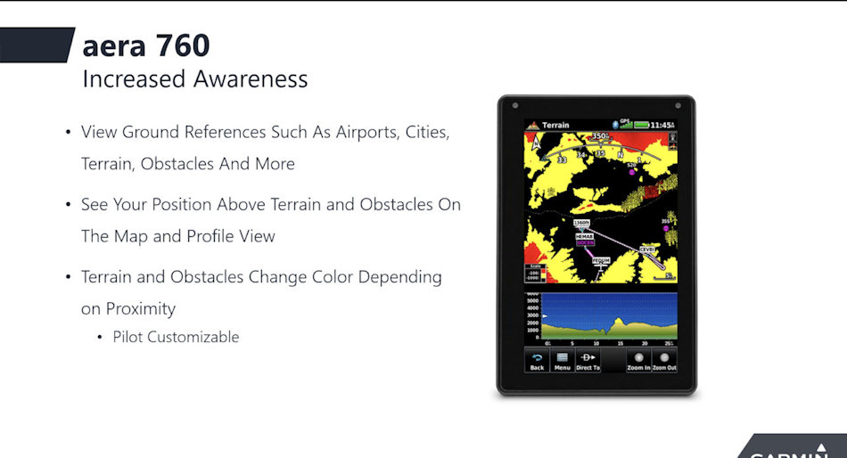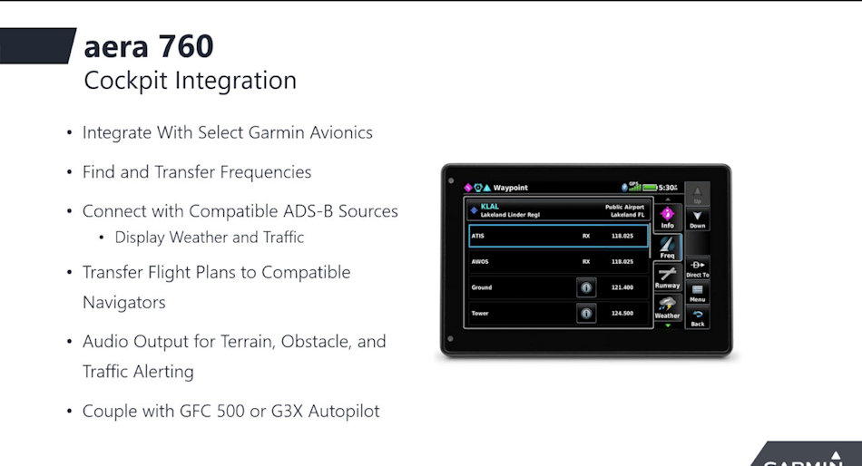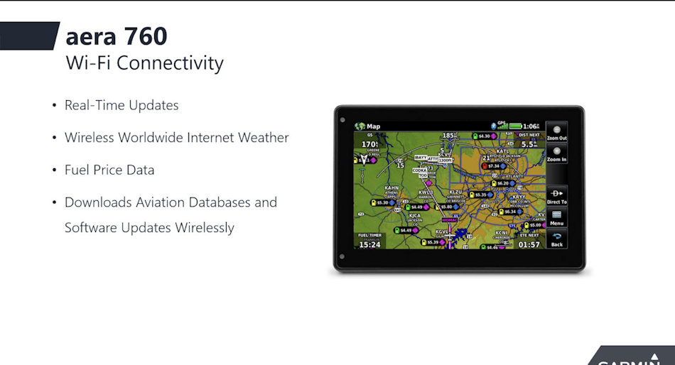 L'aera 760 dispose d'une interface utilisateur intuitive ressemblant à celle de nombreux autres produits Garmin populaires tels que la série GTN ™ Xi, G3X ™ Touch et Garmin Pilot ™ permettant aux pilotes de passer facilement entre plusieurs produits Garmin dans le cockpit. Capable de fonctionner dans des conditions difficiles,
