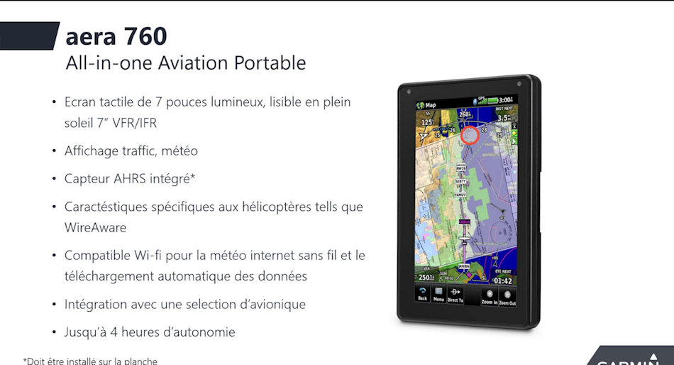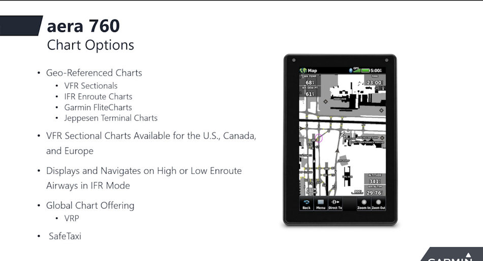 L'aera 760 remplit le rôle d'un sac de vol électronique, avec des cartes géoréférencées, une visionneuse pdf, un ordinateur E6B, une calculatrice de poids et de centrage, un journal de bord et plus encore.