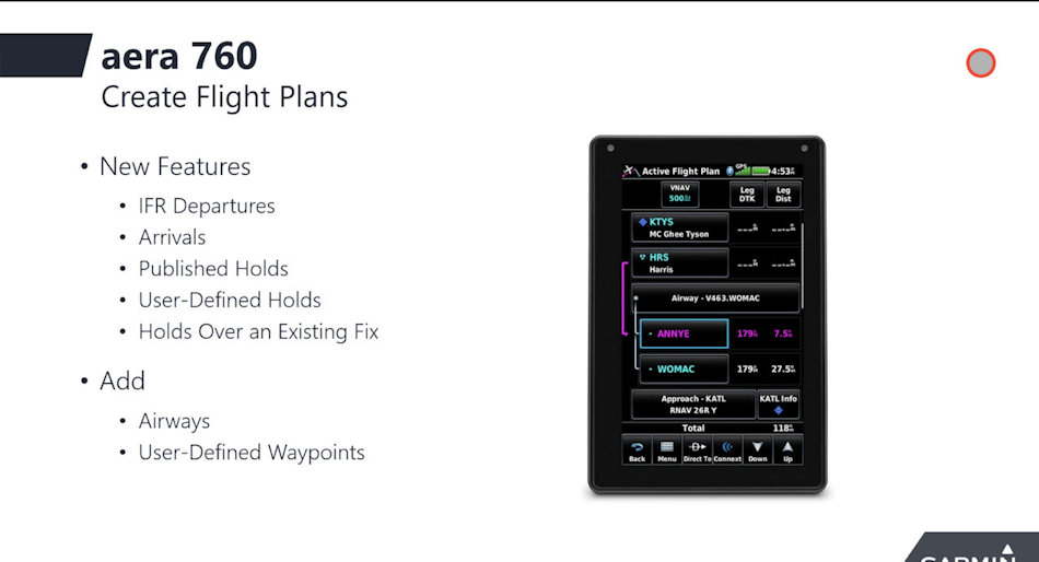 Nouveauté de l'aera 760, les pilotes peuvent charger les procédures de départ, d'arrivée et d'approche aux instruments (IAP) dans un plan de vol, qui peut être transféré sans fil à un navigateur dans le cockpit.