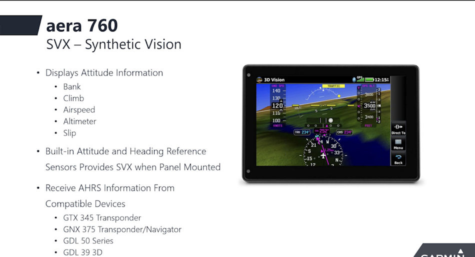 Lorsque l'aera 760 est monté sur panneau ou associé à une source d'attitude compatible telle qu'un GDL® 52 ou GTX 345, les pilotes peuvent visualiser la vision synthétique (SVX), qui ajoute l'affichage des informations d'attitude de secours sur le portable.