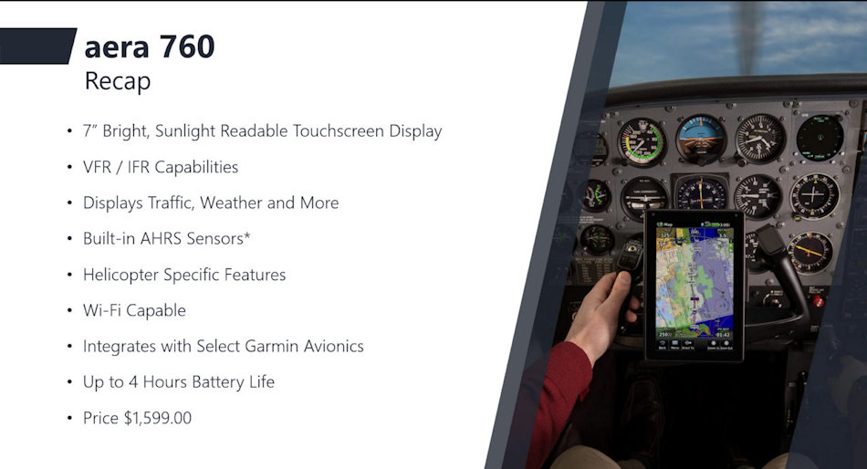 aera 760 combine un grand nombre des capacités de l'avionique montée sur panneau avec un ensemble spécialement conçu et rentable. Il est prêt à voler, dès la sortie de la boîte.