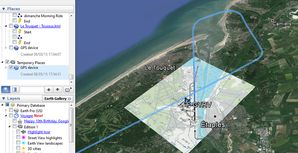 On obtient alors une trace dans GoogleEarth, connecté au sol et sans élévation :