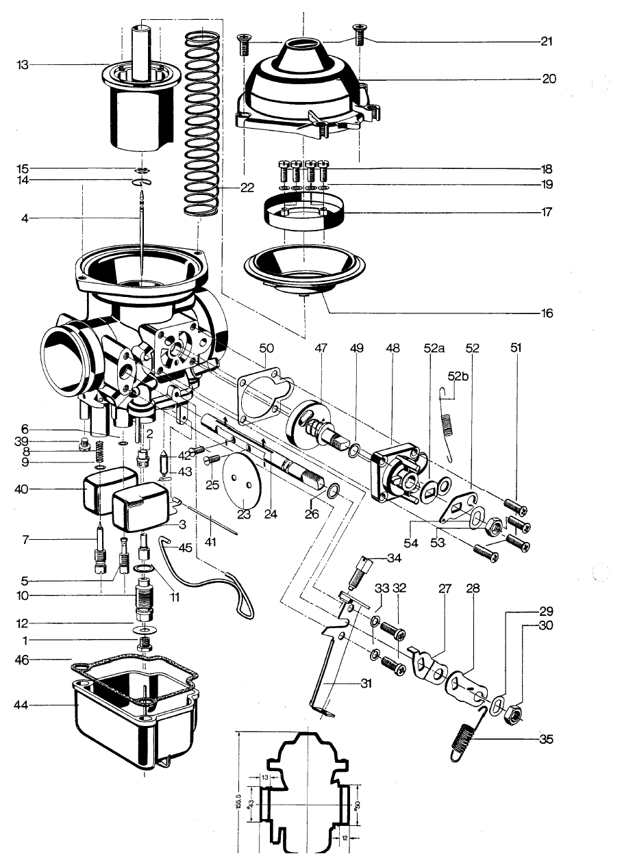 Les quatre vis (51) de fixation du starter sont réputées pour se dévisser toutes seules. Les vérifier régulièrement. Malgré les indications de Bing, l'utilisation de ™Loctite n'est pas forcément une bonne idée : risque de boucher les canaux dans le corps du starter.