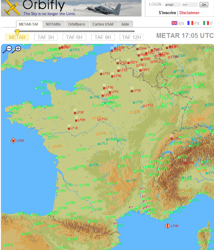 En cliquant sur une station, on obtient donc le Métar avec le « statut » du terrain (VFR ou pas), l'heure (locale ou UTC selon son choix), la pression atmosphérique, la température, la direction et la force du vent. En faisant glisser la page sur son écran, on passe alos au Taf avec une représentation graphique des conditions par tranches horaires.
